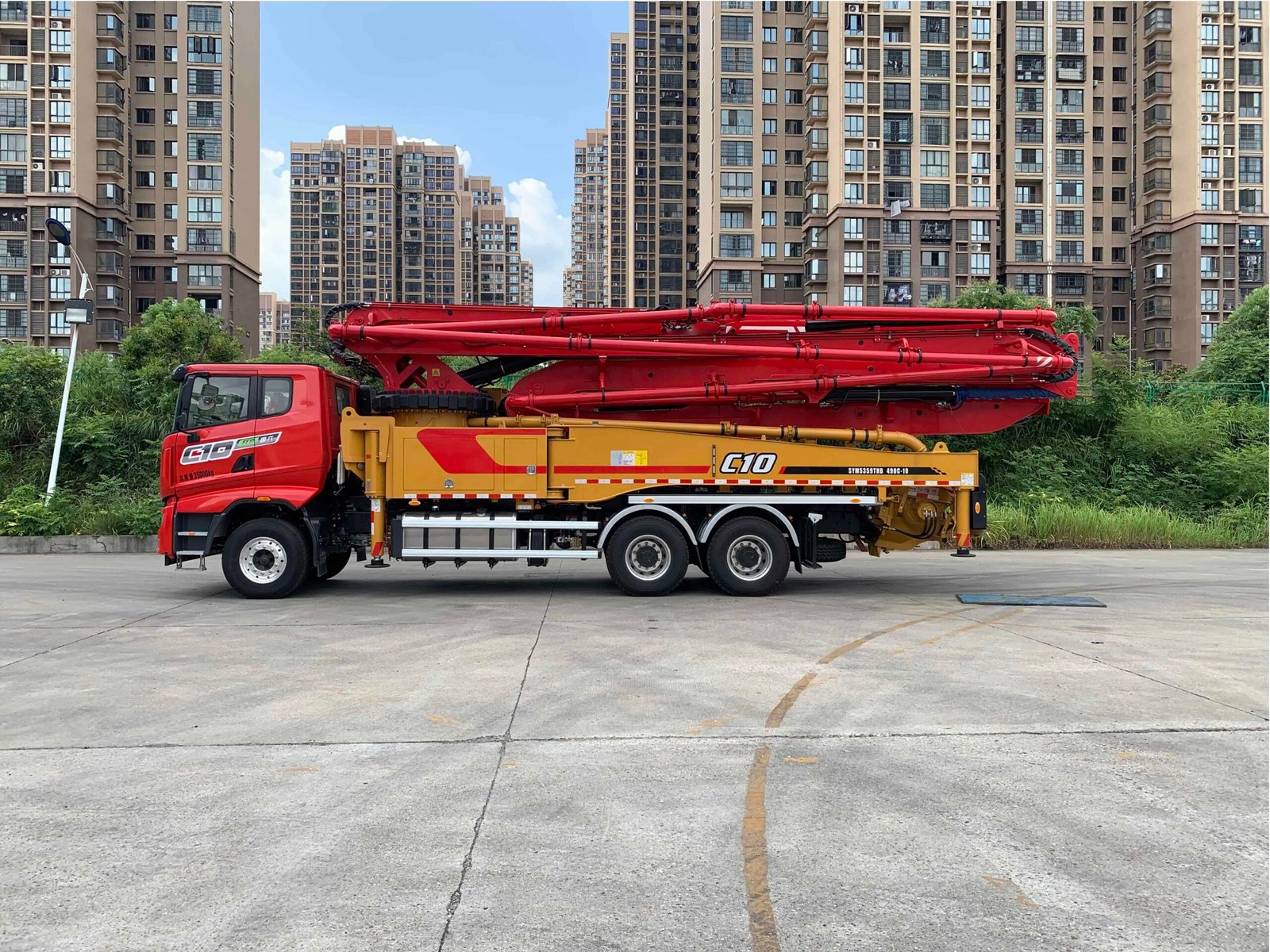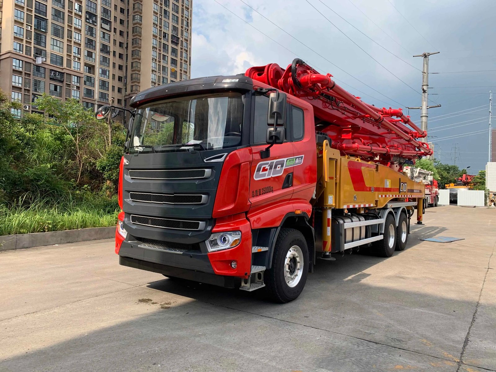 High efficiency 48.6m truck mounted concrete pump with boom, in stock for fast delivery. Ideal for construction projects requiring reliable concrete conveying.